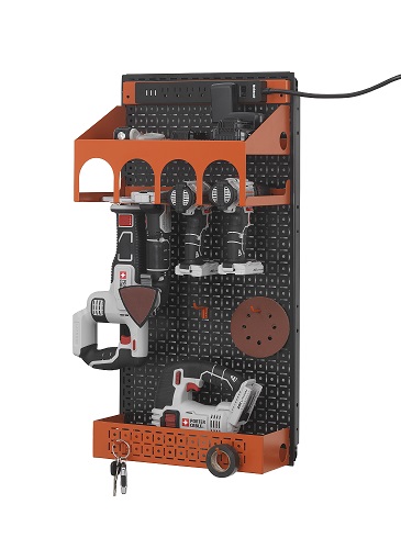 OmniWall USA thought about the use of tools and how to make home improvement projects or automotive tasks easier. The OmniWall Power Tool Kit is a must have kit for the person with multiple drills or power tools. The drill holder attaches to a shelf. The shelf allows the ability to store and charge batteries so they are ready for use when you are! The power strip is one of the attachments included in this kit. Add the Power Tool Kit to any other kit and have the most advance and sturdy wall organization system on the market. This kit can have vertical or horizontal configuration. Organizing power tools in the garage on a metal pegboard will help make all your projects a little easier. Made in the USA.